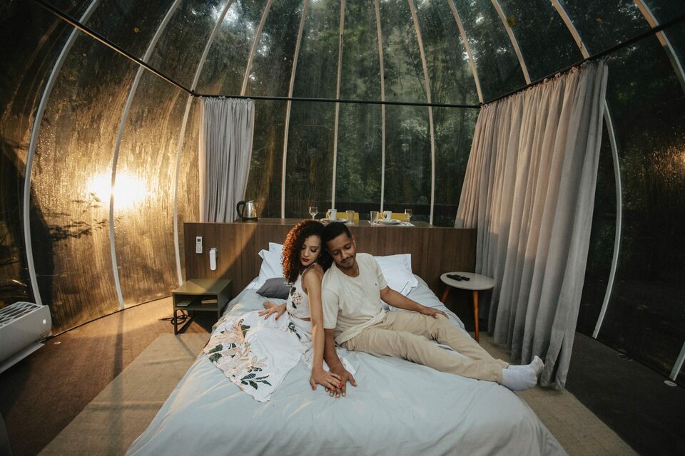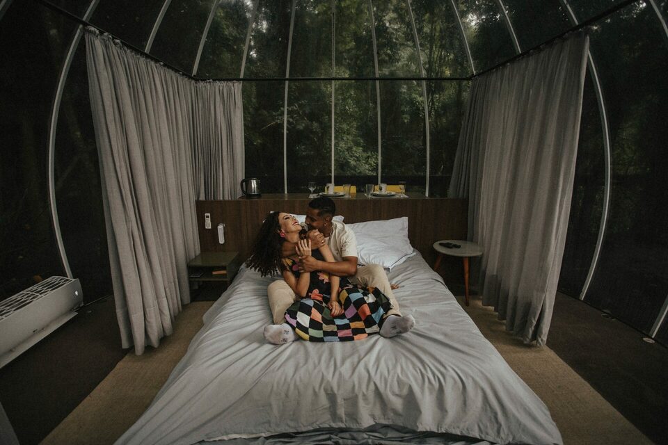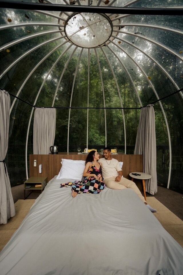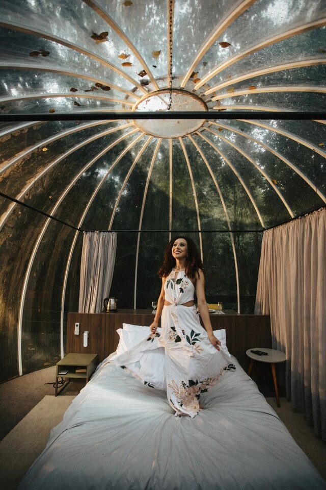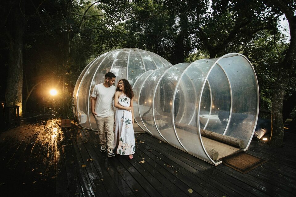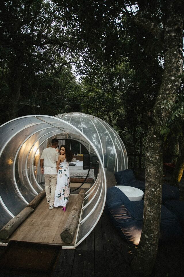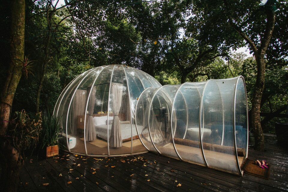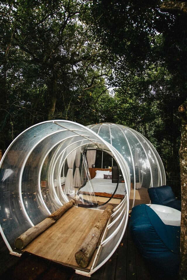 A bolha, uma acomodação minimalista toda transparente imitando uma bolha em meio a mata com total privacidade, vale muito a pena conhecer essa acomodação moderna e aconchegante.
