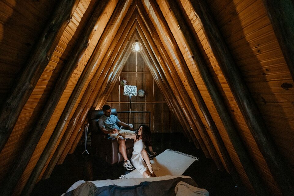 Cabana do vento e da mata, toda em madeira trazendo um ambiente rústico e aconchegante, com fogão a lenha, mesa de jantar no estilo chabudai, ar-condicionado e uma cama maravilhosa montada na parte de cima da cabana com uma vista do vale.